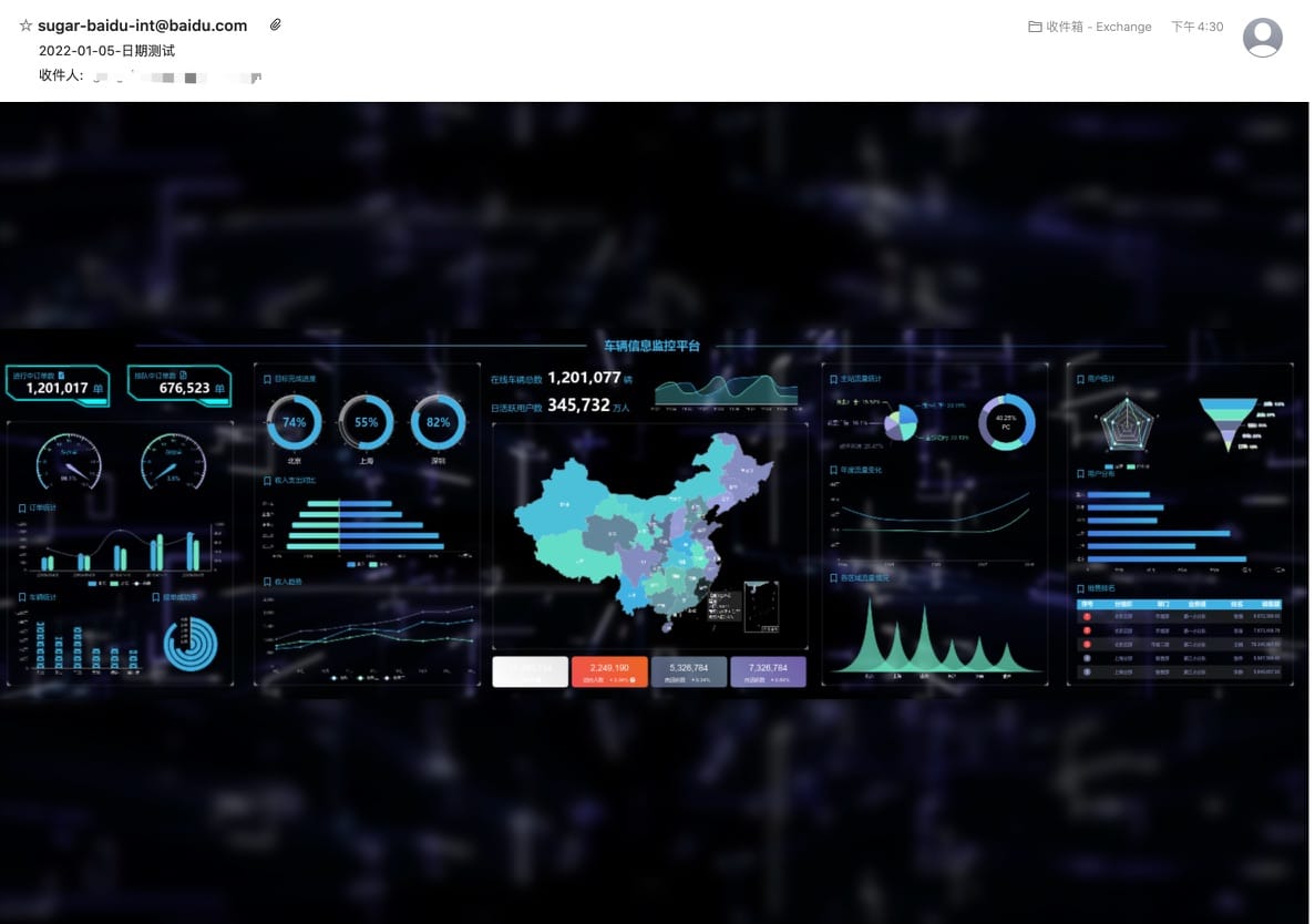注意:云上Sugar BI的定时邮件截图中不支持Iframe、自定义图表等用户可写代码的组件,私有部署中支持。