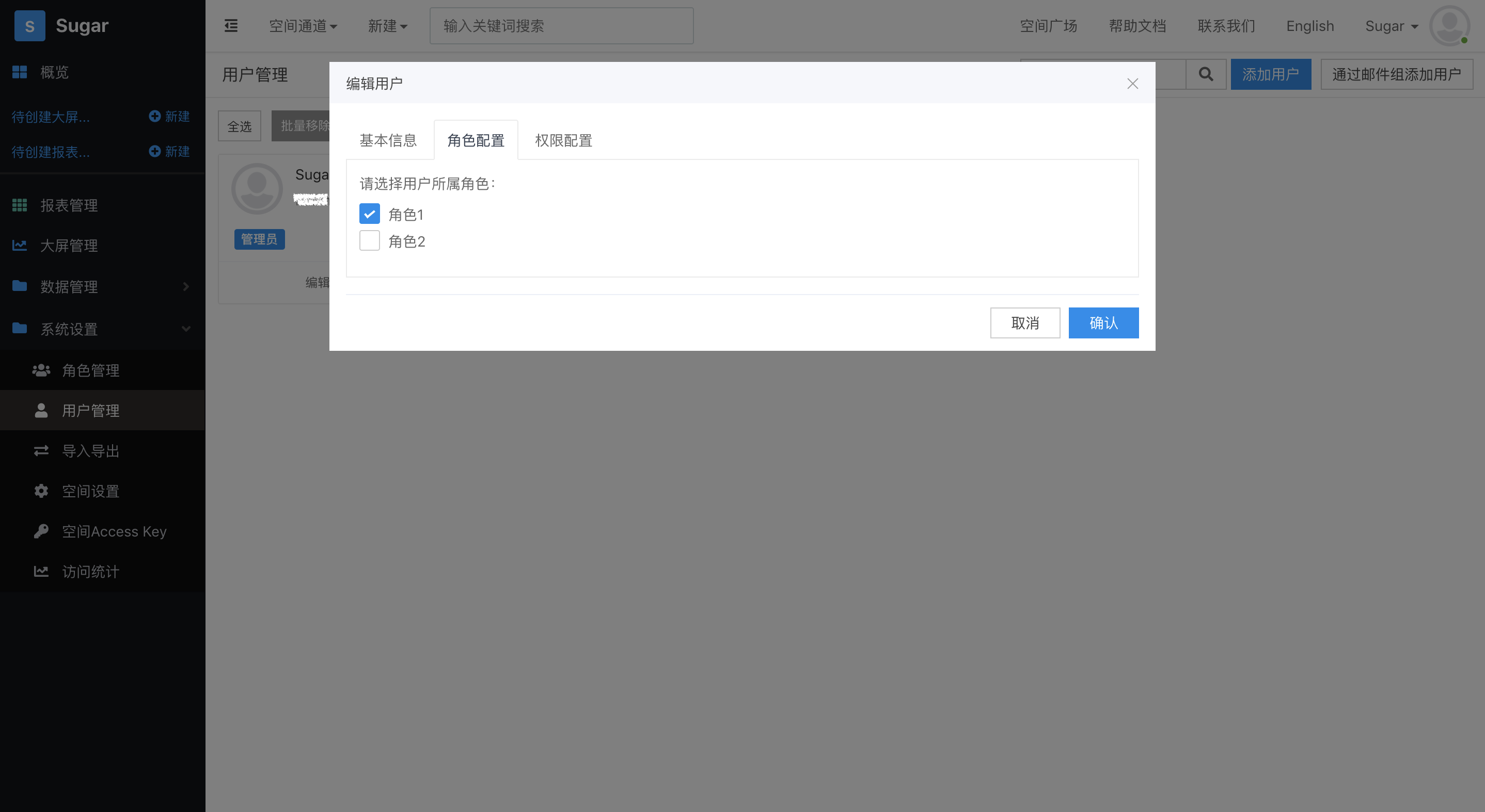 在弹框的第二个选项卡中可以选择用户所属的「角色」。选定后用户也会拥有所属角色的所有权限: