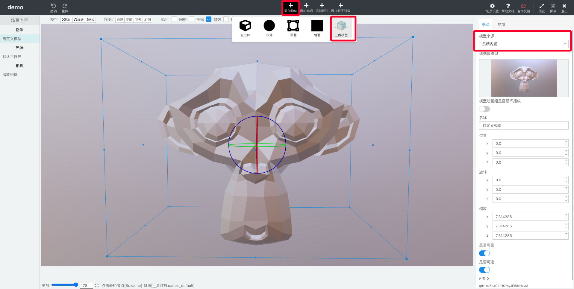 在「内容区域」中点击「添加物体」按钮,导入三维模型。我们选取Sugar BI内置的图片为例,您可以通过右侧「属性面板」更换模型。也可以上传自定义三维模型,(云上 SaaS 版支持最大上传 10MB 的模型文件,私有部署版本中不限制模型文件的大小,建议 20MB 以内),目前支持 ifc/fbx/gltf/glb 格式的模型。
