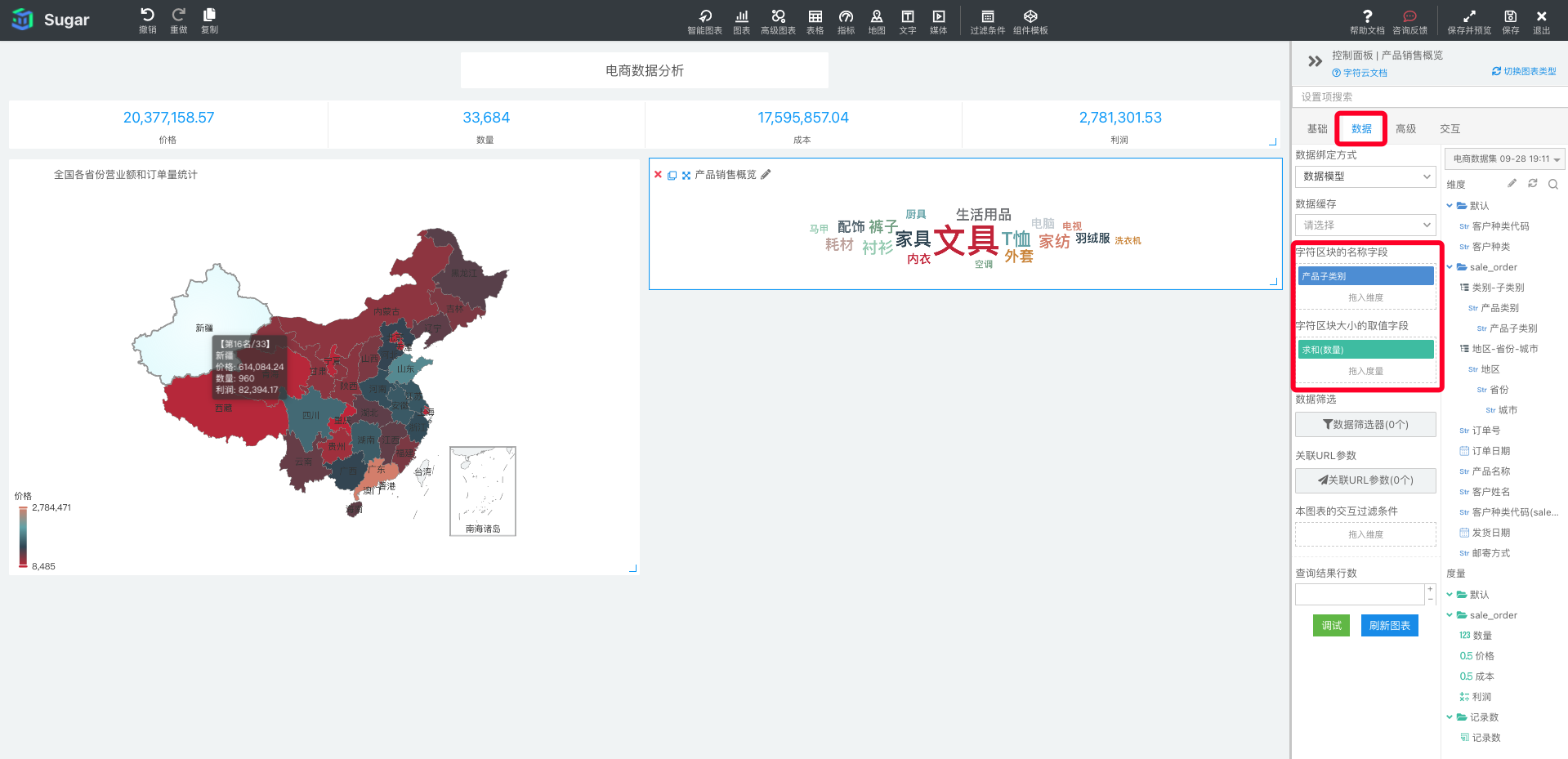 这里我们选用「字符云」组件展示各个产品子类别的销售量概况,不同字符的大小可以显示词频,对出现频率较高的关键词予以视觉上的突出,也使整个报表样式更加生动。