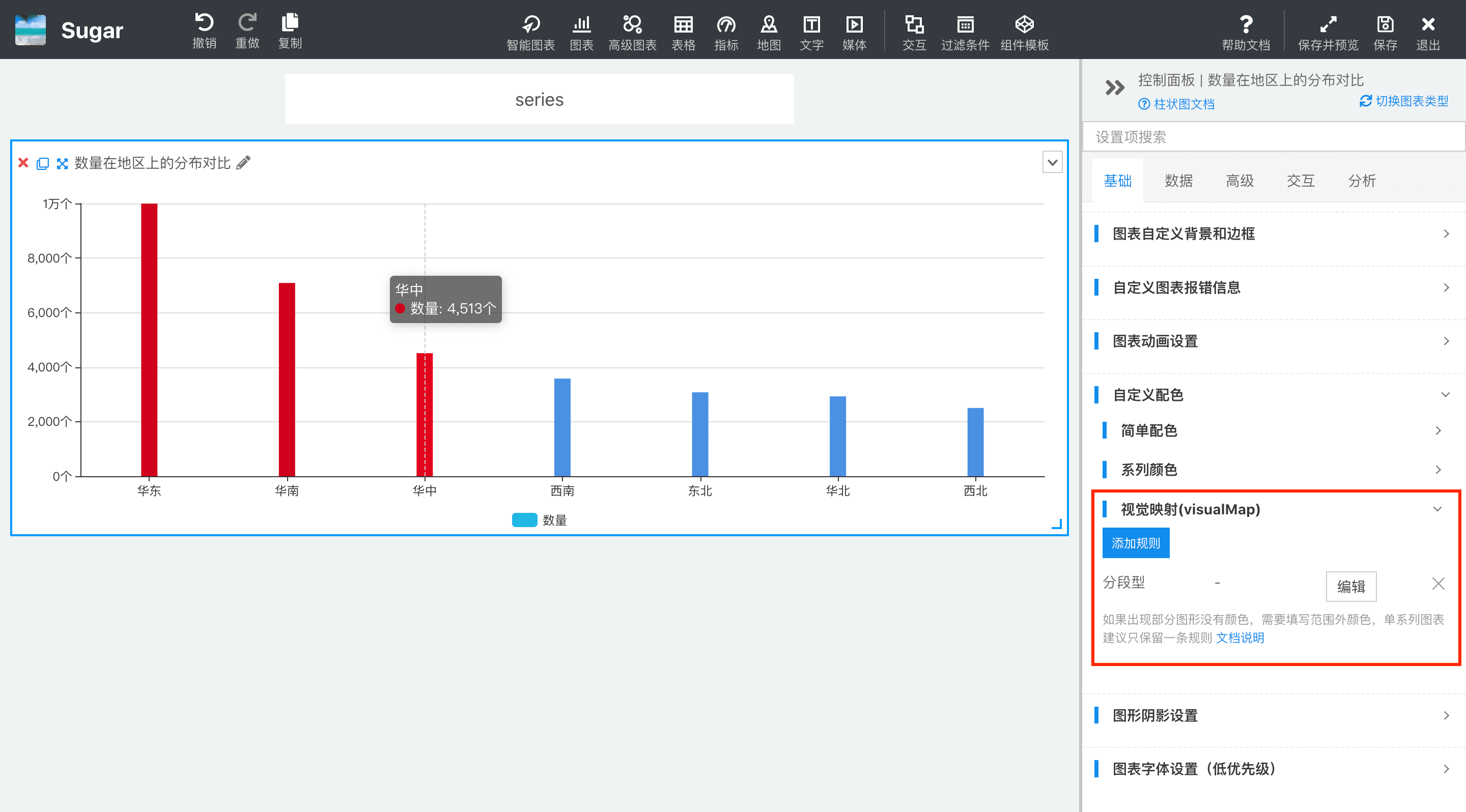 注意:单系列图表只能使用到一条视觉映射规则,不要添加多个规则,多系列图表不要出现某个系列对应多条规则,容易导致图表出错。