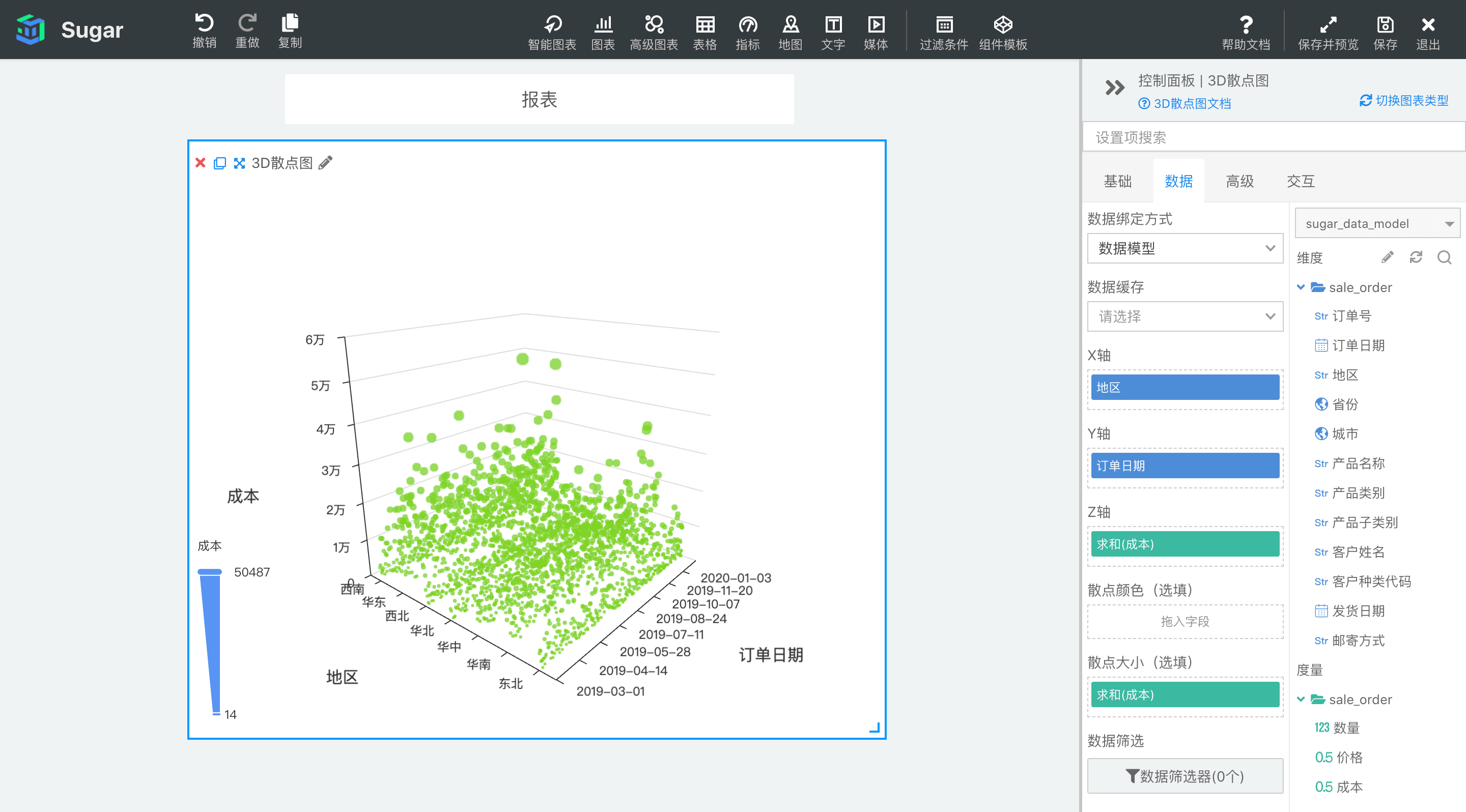 3D 散点图可以同时展示数据的 5 个维度和度量,包括:X 轴,Y 轴,Z 轴以及颜色映射和散点大小映射。