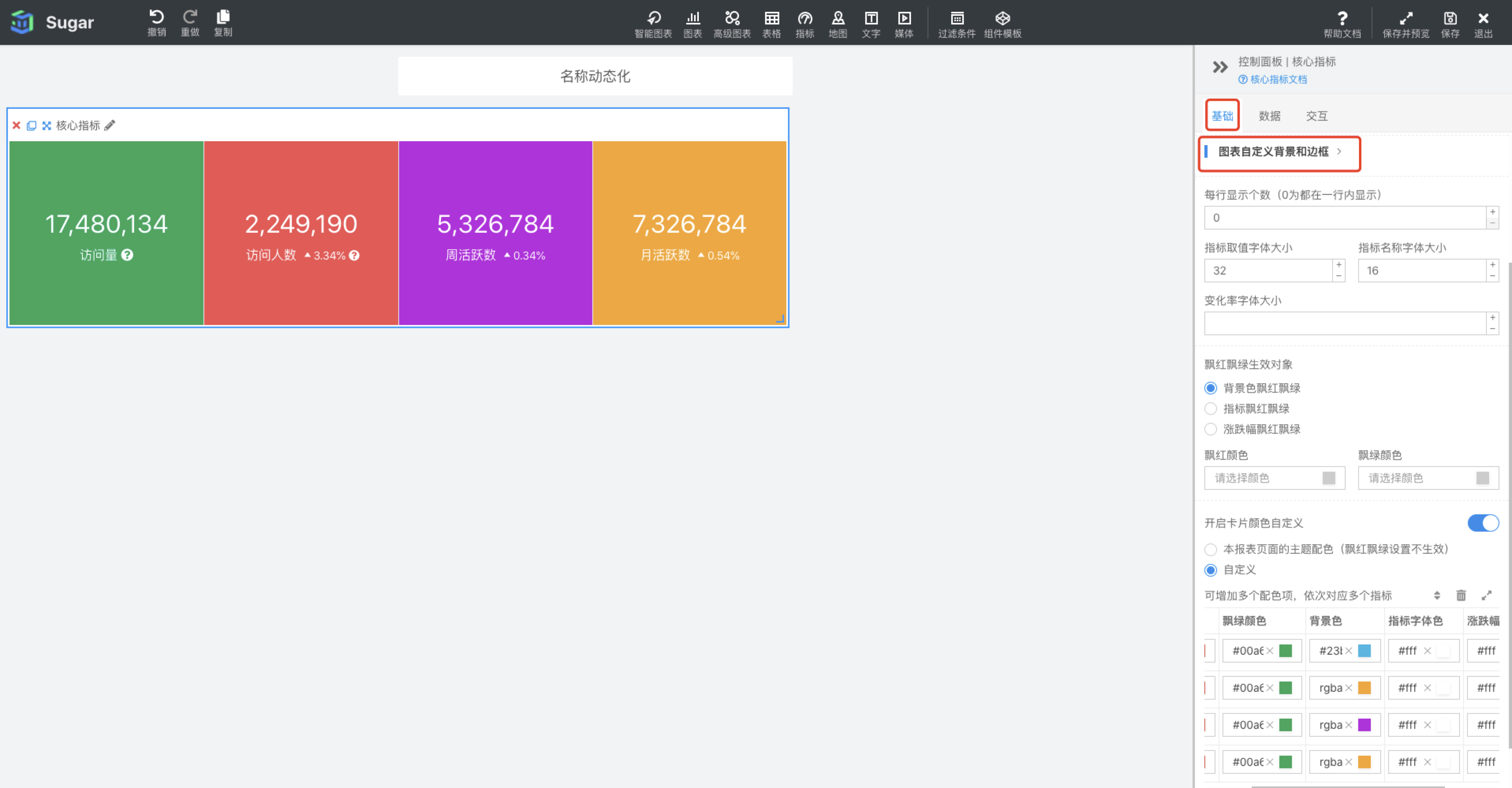 如果选取「基础」->「图表自定义背景和边框」中选择「本报表页面的主题配色」则核心指标的风格将与整个报表的颜色主题保持一致。 用户也可以自己选择颜色,添加的配置行分别对应每个卡片