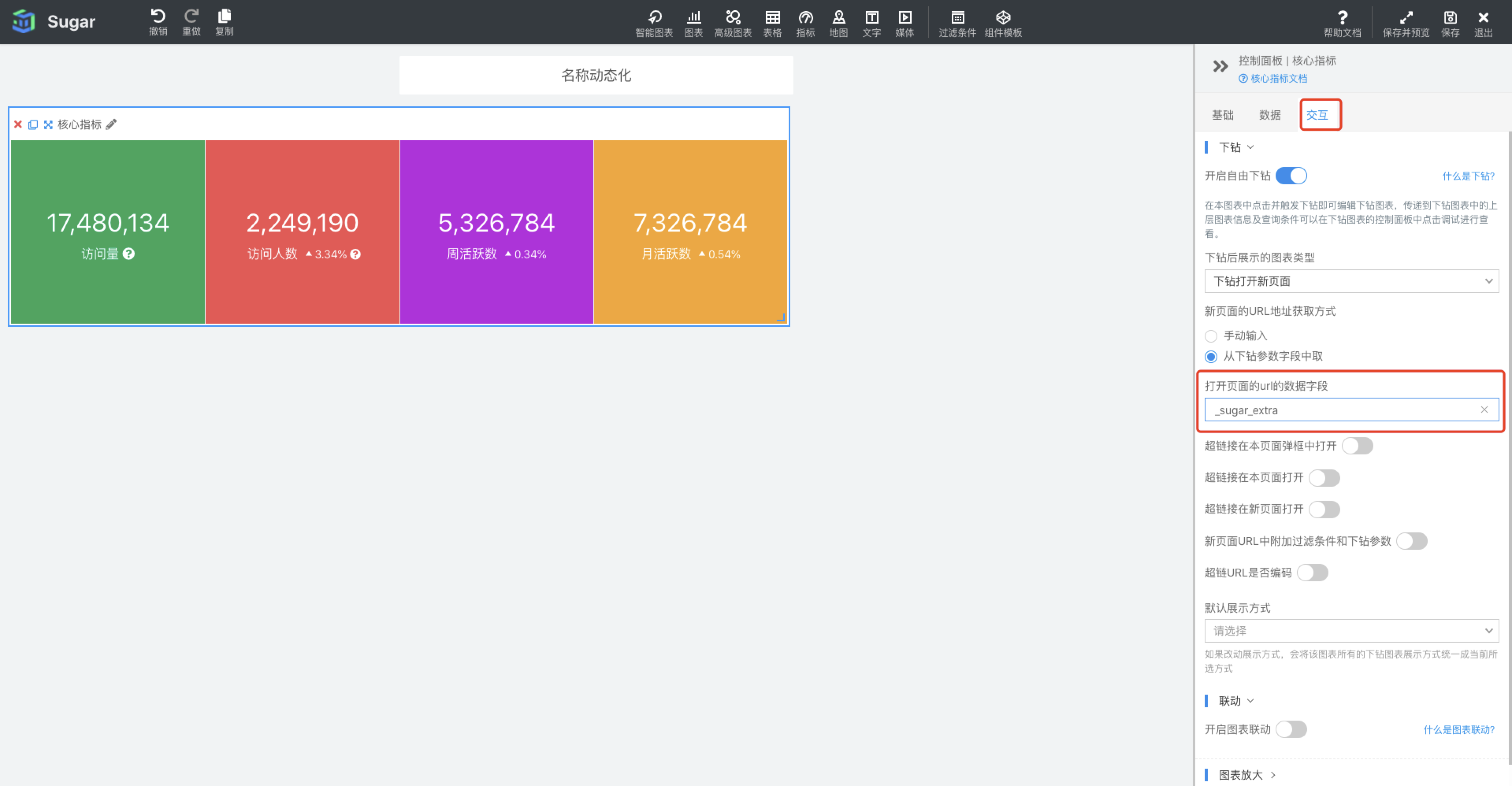 然后在「交互」->「下钻」配置中的「打开页面的 url 的数据字段」处填写_sugar_extra:
