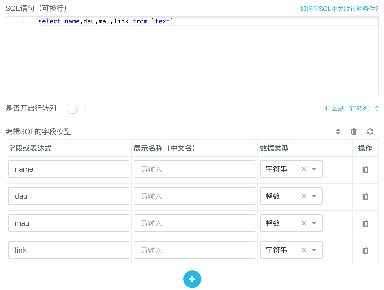 然后在编辑文本内容时,我们预留了一些标识,并且这些标识和上面 SQL 模型的字段是一一对应的,都有name、dau、mau字段: