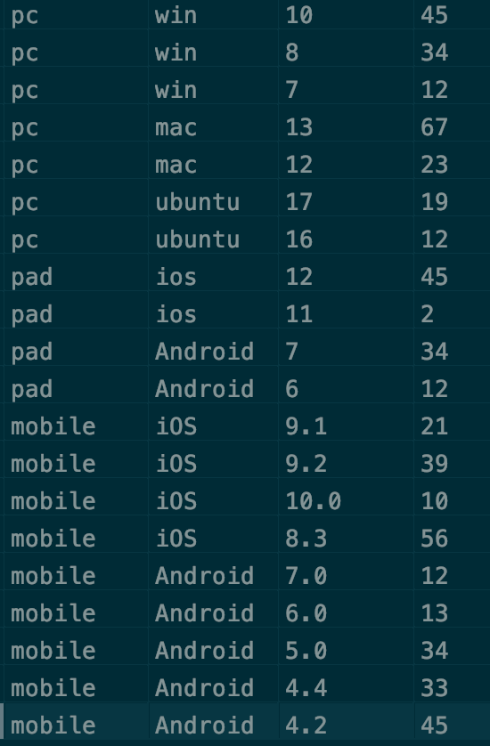 假设数据库中我们有这样的四列数据,分别对应平台名称,操作系统名称,操作系统版本,使用人数: