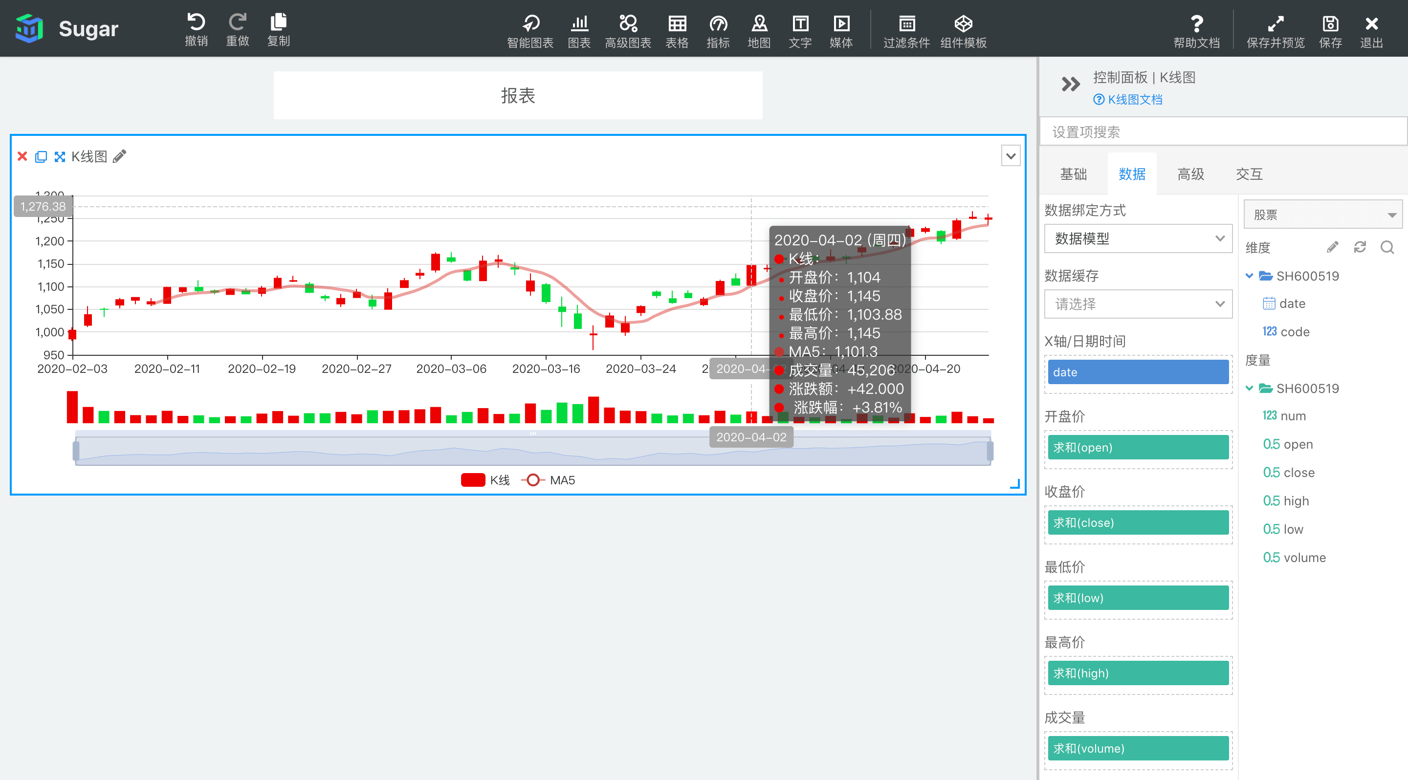 K 线图⽤于展示⼀组数据分散情况,特别适⽤于对⼏个样本的⽐较,是股票走势数据的常用展示形式: