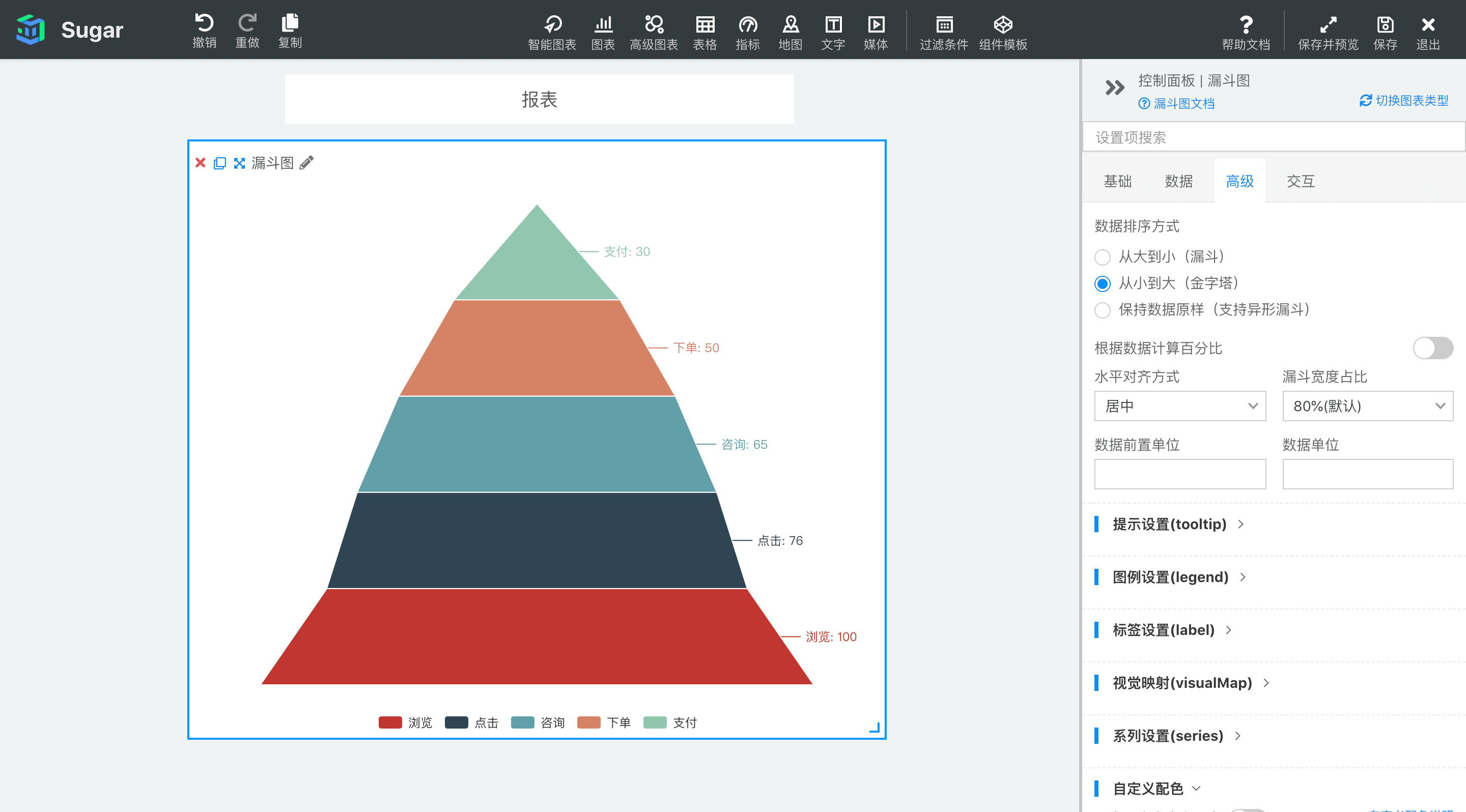 漏斗图适用于展现各个业务环节间的差异分析,如转化率和流失率.