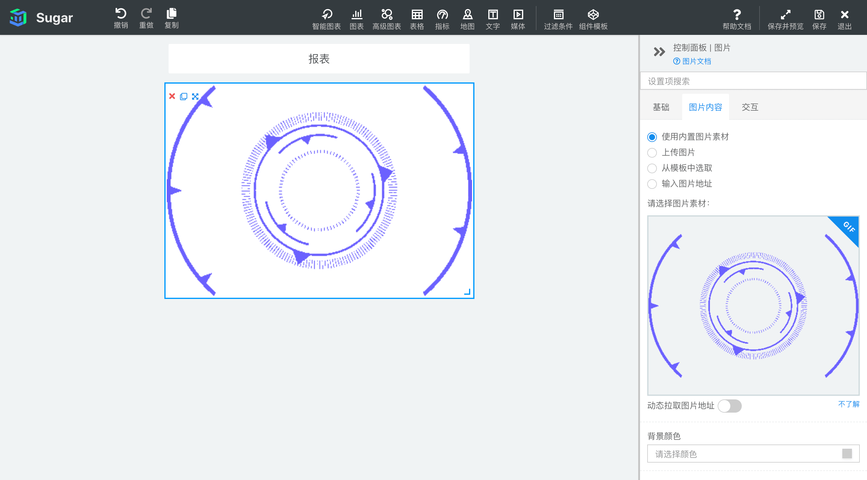 图片图表提供一些内置的装饰性图片使您可以将大屏配置的更加美观,您也可以上传自己的图片或是直接输入图片地址放置在大屏中。