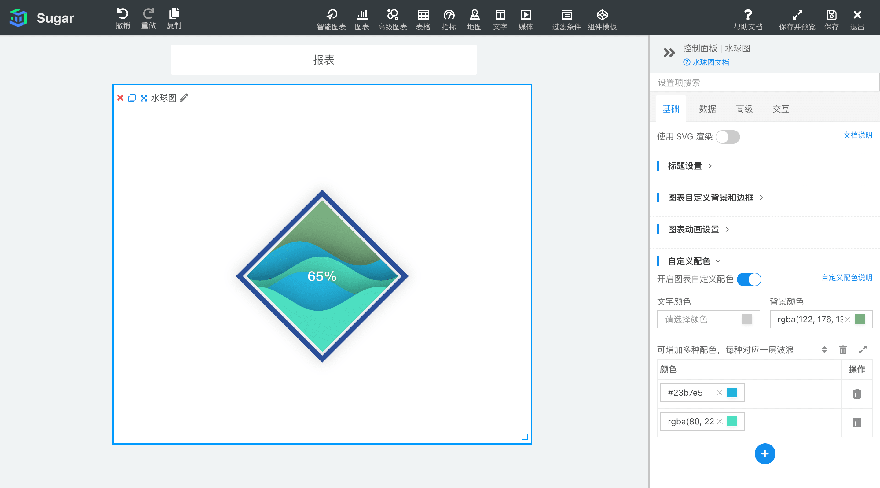 高级设置中,可以设置波浪动画效果,水球图的形状以及百分比数字的大小等: