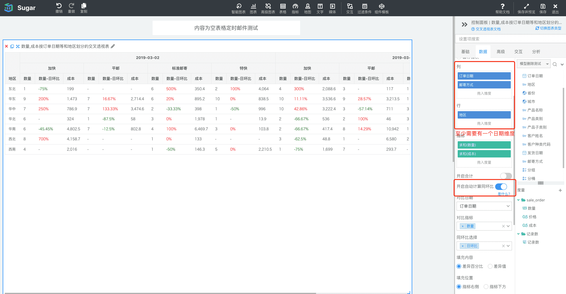 当表格中绑定了日期维度和度量时,此时可以开启并配置自动计算同环比。