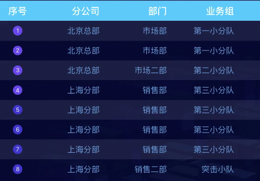 在高级设置中,您可以对轮播间隔和轮播速度进行设置,轮播间隔对应每页的停留时间,轮播速度对应翻一页所需要的时间。 轮播表格支持配置序号列,可以设置序号的形状,列宽,高亮前 N 个等。