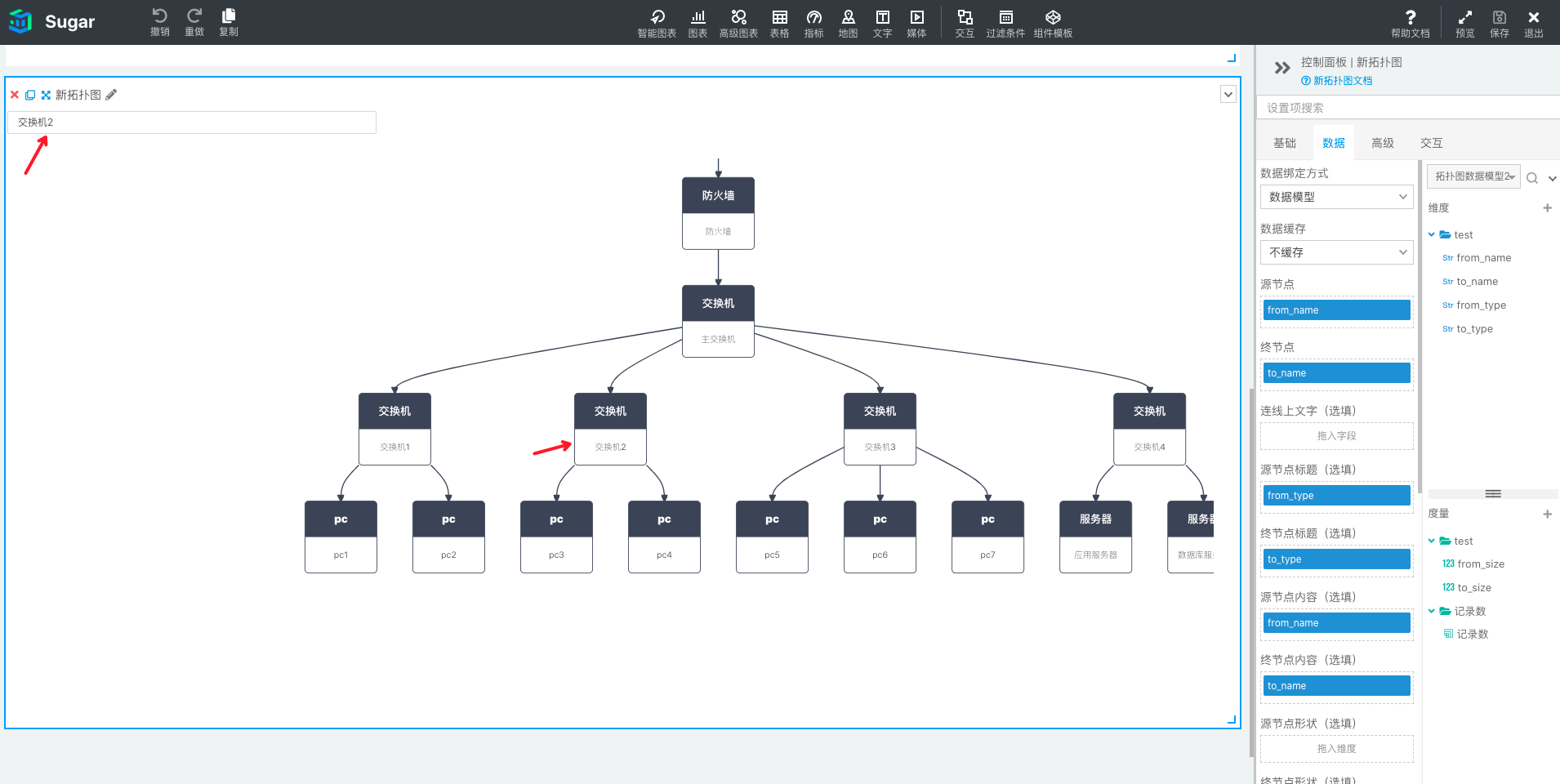 您可以通过设置用于控制节点大小的字段,将节点区分大小展示。如下图:在「源节点大小」字段中拖入「fromsize」,并指定节点最大宽度与最小宽度,新拓扑图中展示的源节点大小将根据「fromsize」的取值大小,在设定的最大宽度和最小宽度范围内动态展示。