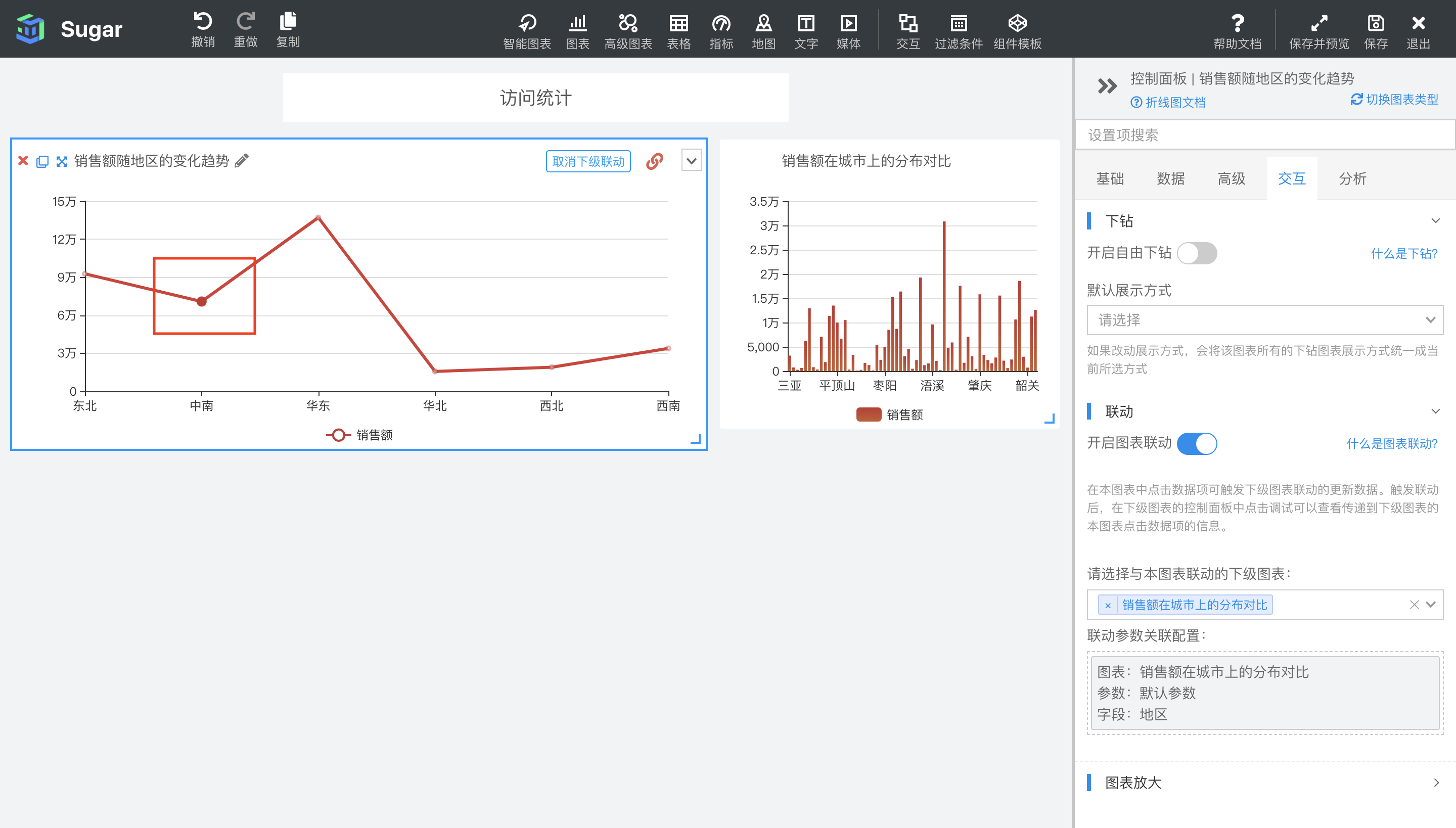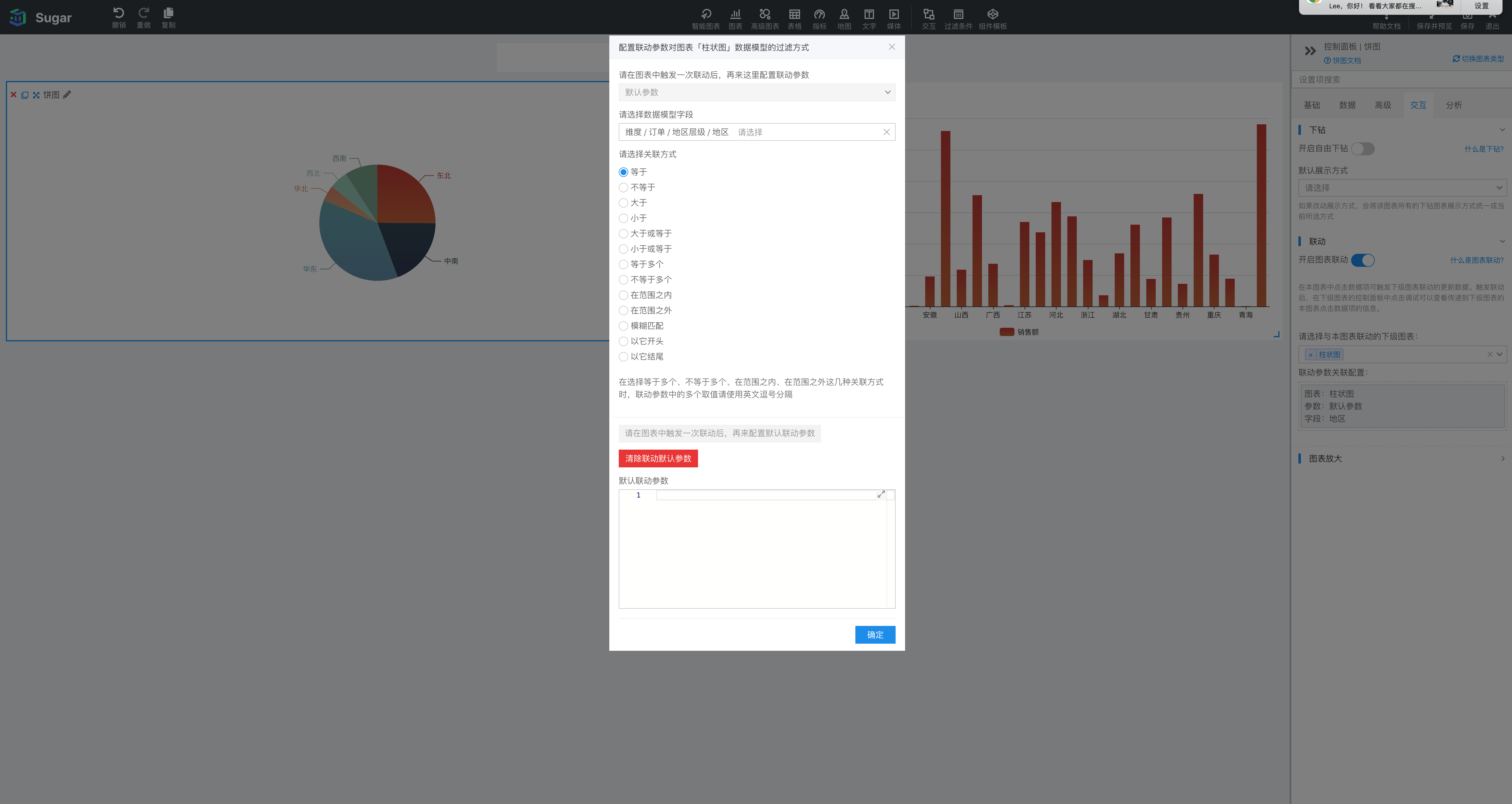 首先在图表上点击想要设置的联动默认值,比如中南地区,然后在图表的联动参数关联配置中点击使用当前联动参数作为联动默认参数按钮,可以将当前联动参数设置为联动默认参数。