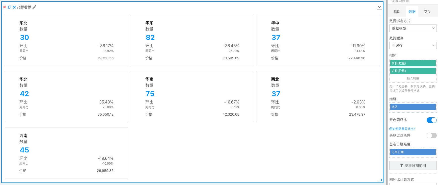 我们想设置分别主指标值颜色、同环比数值颜色、背景色,可以这样设置,在主指标上右键,选择条件格式。增加三条规则,分别对应值、环比、同比,然后设置相应的规则,确认后,在「基础」-> 「飘红飘绿生效对象」中设置「根据条件格式自适应」即可。