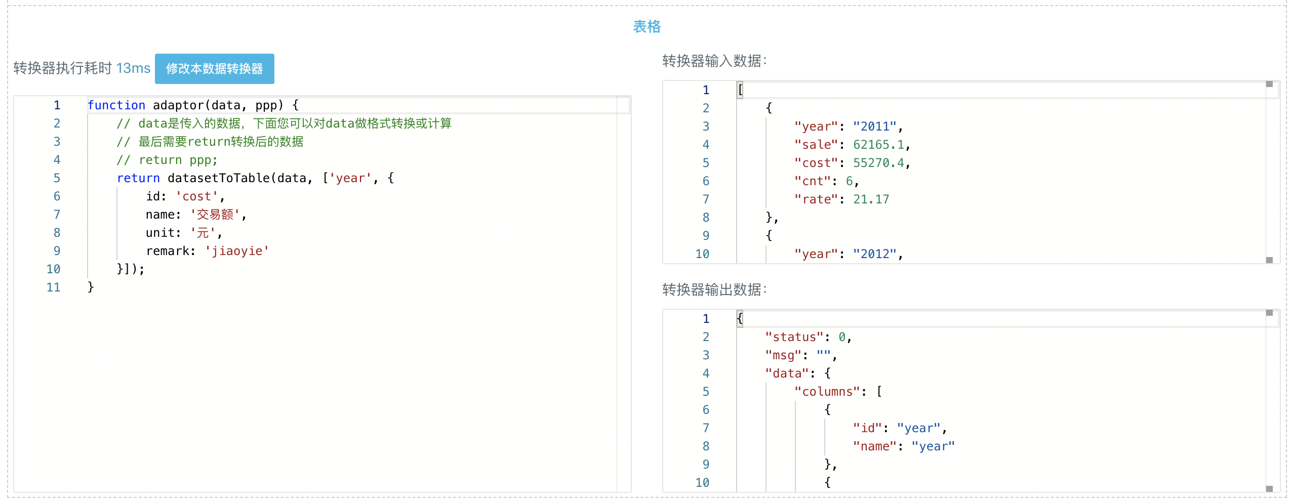 对于 API 返回的数据,用户可以写Javascript代码(API 数据转换器)来实现数据结构转换、数据筛选展示和一些简单的计算。