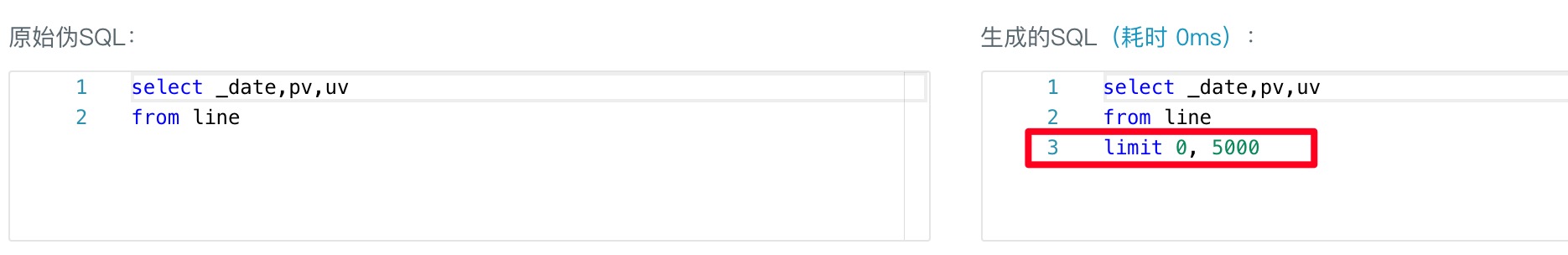 在Sugar BI中,为了防止 SQL 语句查询的结果太大,我们会默认在 SQL 语句的最后添加上limit 0, 5000这样的语句来限制查询结果的行数(limit 0, 5000是 MySQL 的语法,不同类型的数据库,默认添加的语法会不一样),如下图: