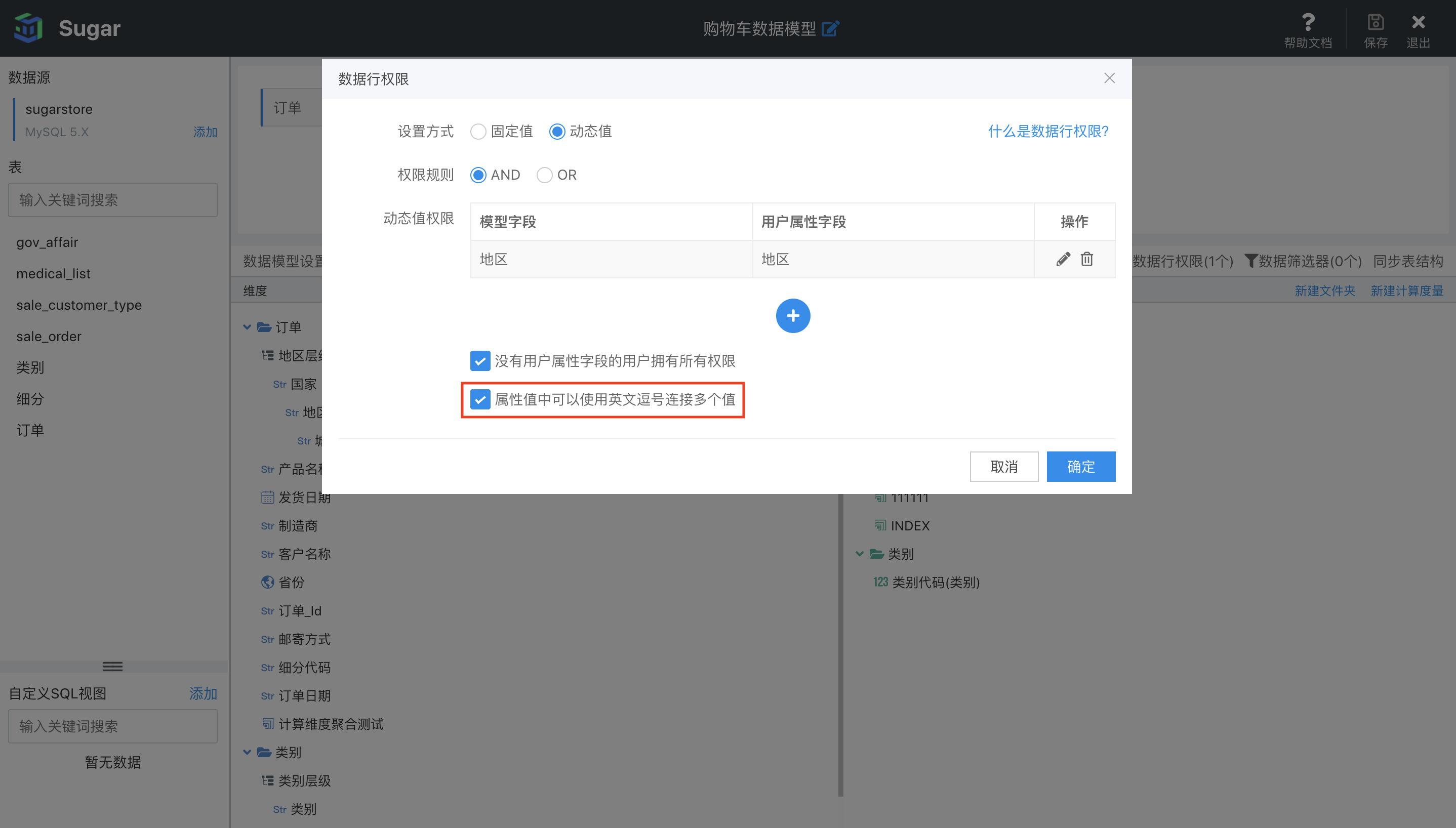 动态值的设置中有一个属性值中可以使用英文逗号连接多个值的选项,如果勾选了这个选项,可以实现多选的逻辑。比如当前动态值设置的仍为地区字段,A 用户的属性值设置为"东北,华北,西北",那么在进行行级别权限判断的时候,就会为 A 用户查找东北,华北,西北这 3 个地区的数据。