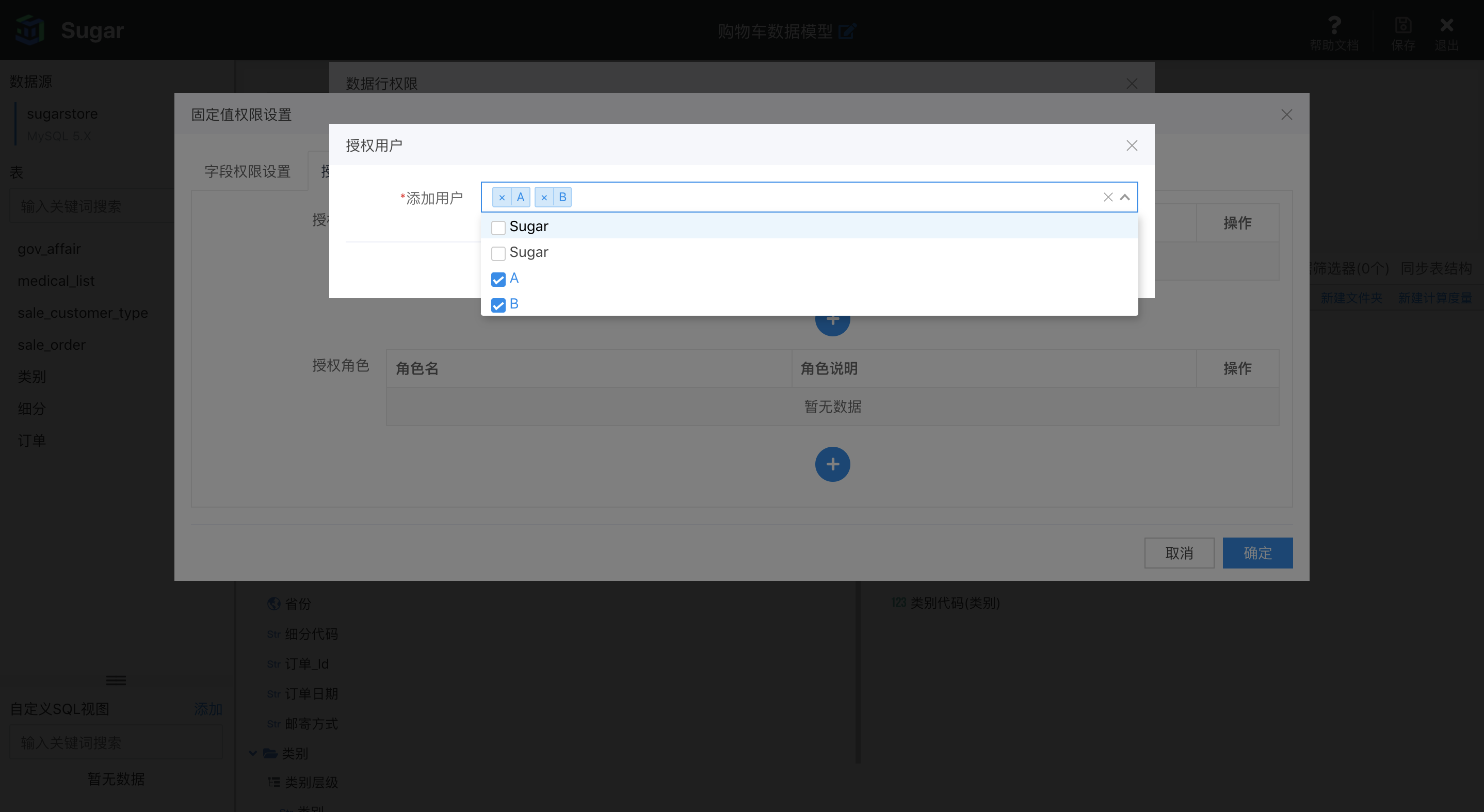 设置完用户 A、B、C 的权限之后,点击确定返回最初设置页面,可以看到一个「未添加权限用户拥有所有权限」的复选框,不勾选时,未设置权限的用户 D 默认看不到该数据模型中所有地区的数据;如果勾选了这项,那么用户 D 可以看到所有地区的数据。所以此处这项不勾选。