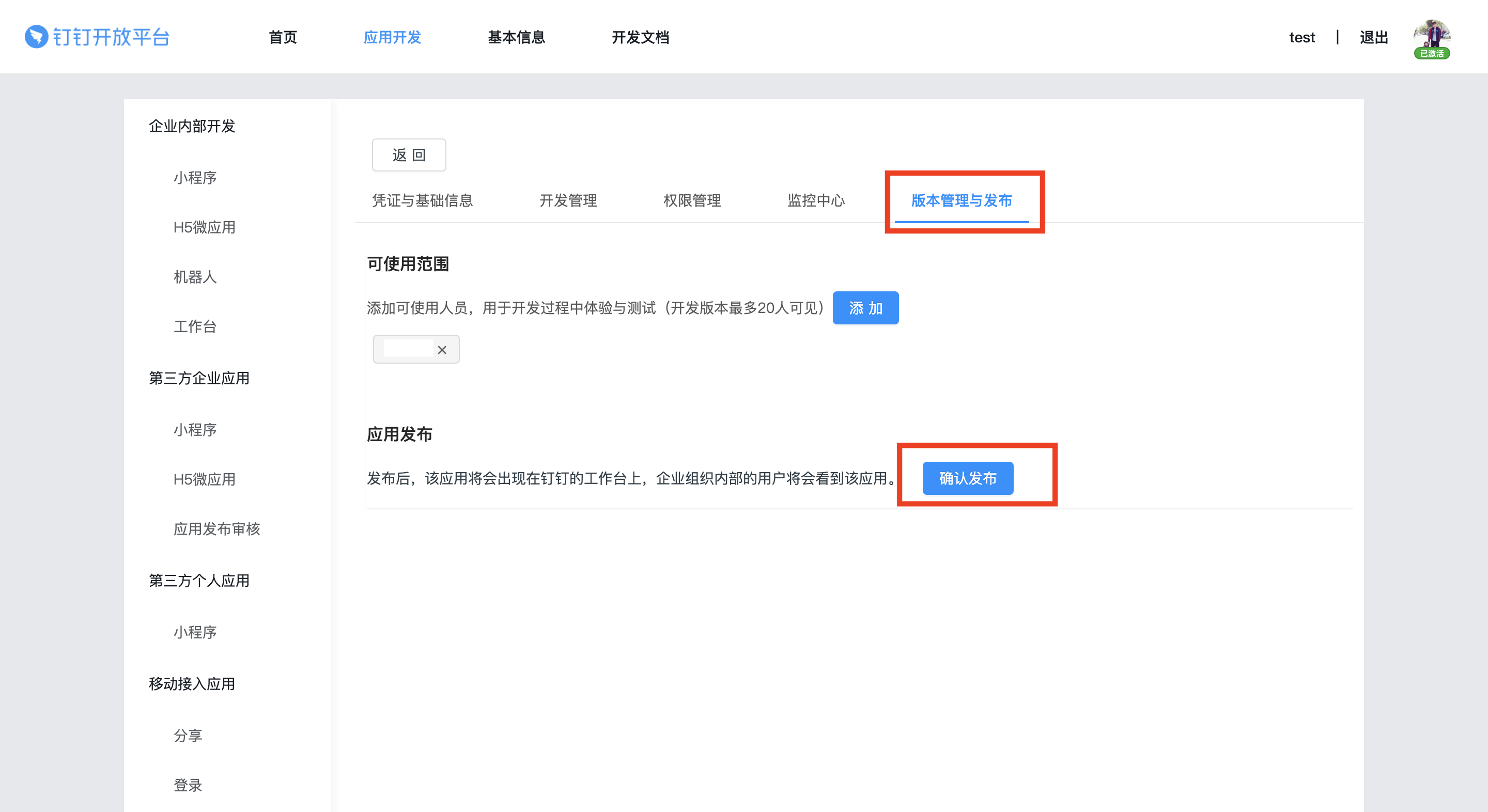 在企业内部应用-H5微应用中点击您创建的应用,选择版本管理与发布,点击确认发布。发布成功后选择可使用范围。