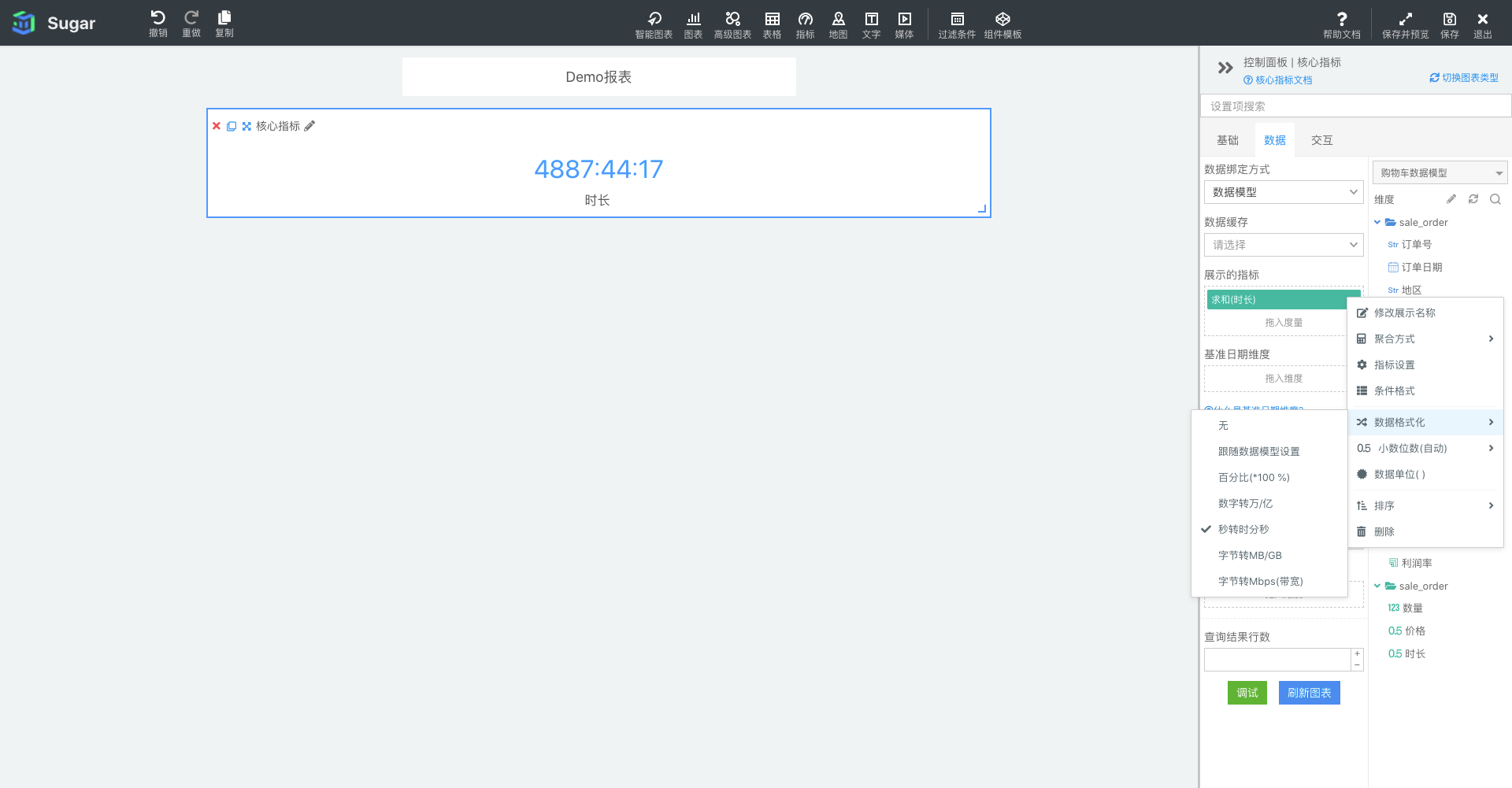 也可以在数据模型上对度量字段进行设置,如下图。在数据模型上设置了格式化方式之后,所有使用该数据模型的图表都将生效,相当于在一处设置即可影响多个图表。当然,如果在图表绑定字段时又重新进行了设置,那么就会覆盖数据模型上的设置。