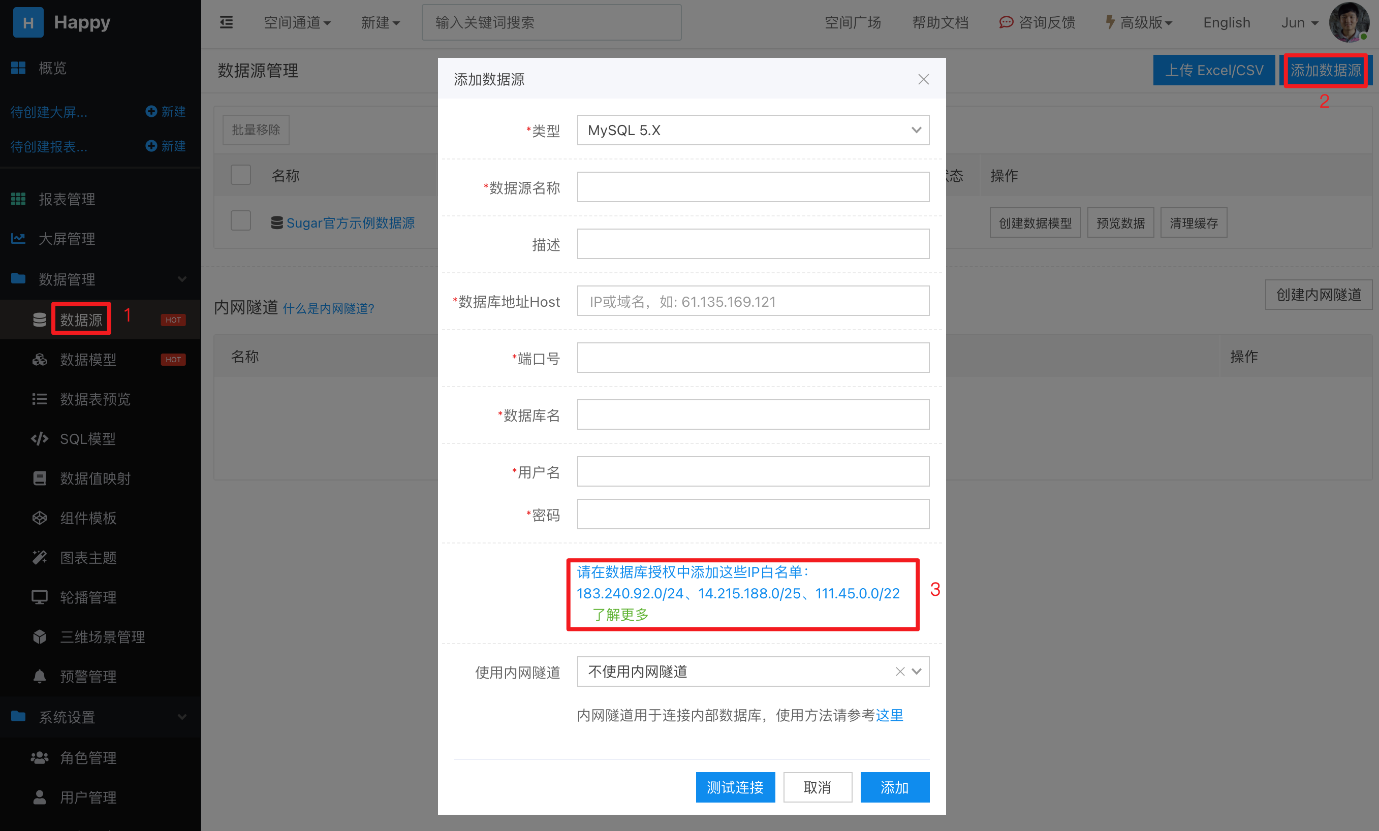 进入空间后,点击左侧导航中的「数据源」>「添加数据源」,即可看到Sugar BI的 IP 列表