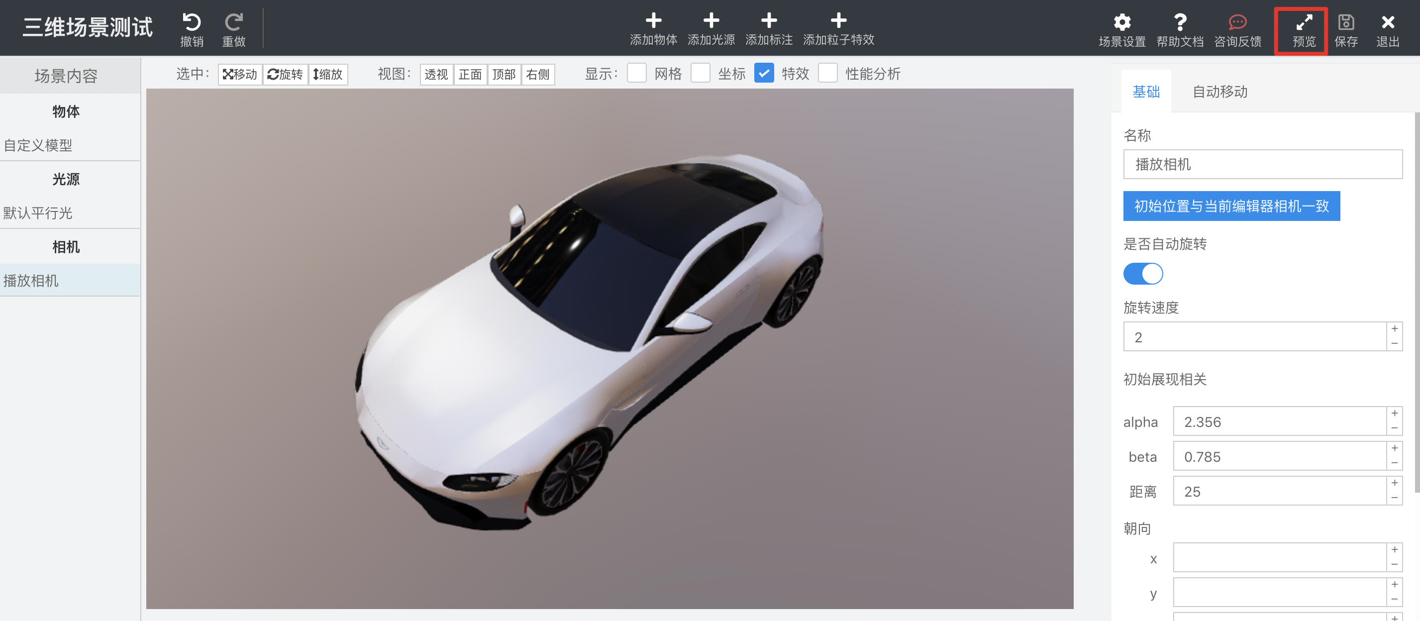 可以点击右上角的「预览」按钮,查看播放相机下的效果。