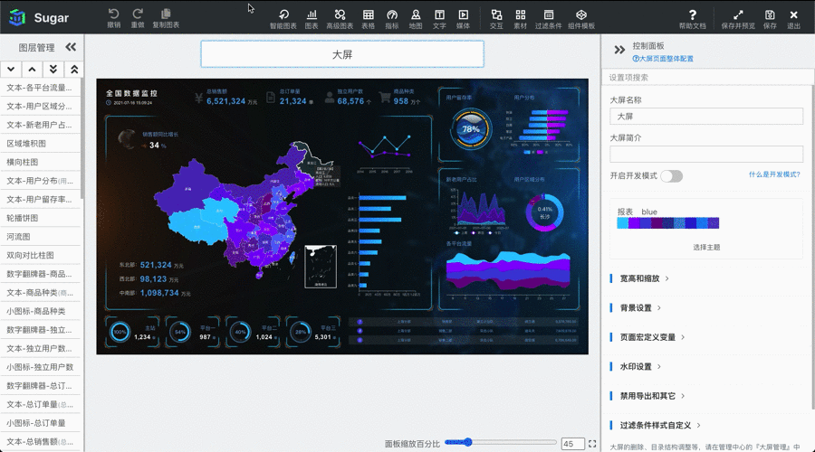 进入大屏编辑页面后,您可以对图表进行拖拽式操作,改变图表的大小和位置,新建或更改文字、图片等,如下: