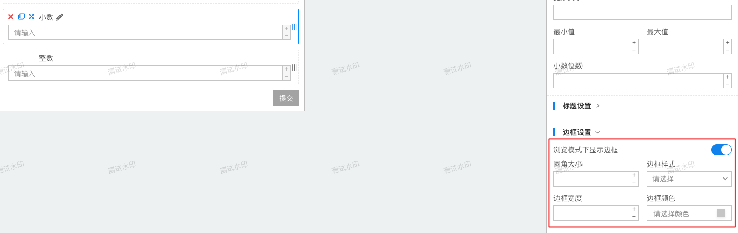 当开启了「浏览模式下显示边框」后,您就可以设置表单非编辑状态的边框样式,包括圆角大小、边框样式、边框宽度和颜色: